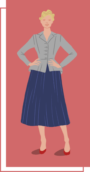 A lot of women worked as typists after WW2; hemlines sitting just below the knee and dresses getting looser. Hair was short and parted to the side so it wouldn’t get in the way of typing.