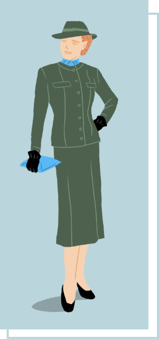 A lot of women worked as typists after WW2; hemlines sitting just below the knee and dresses getting looser. Hair was short and parted to the side so it wouldn’t get in the way of typing.